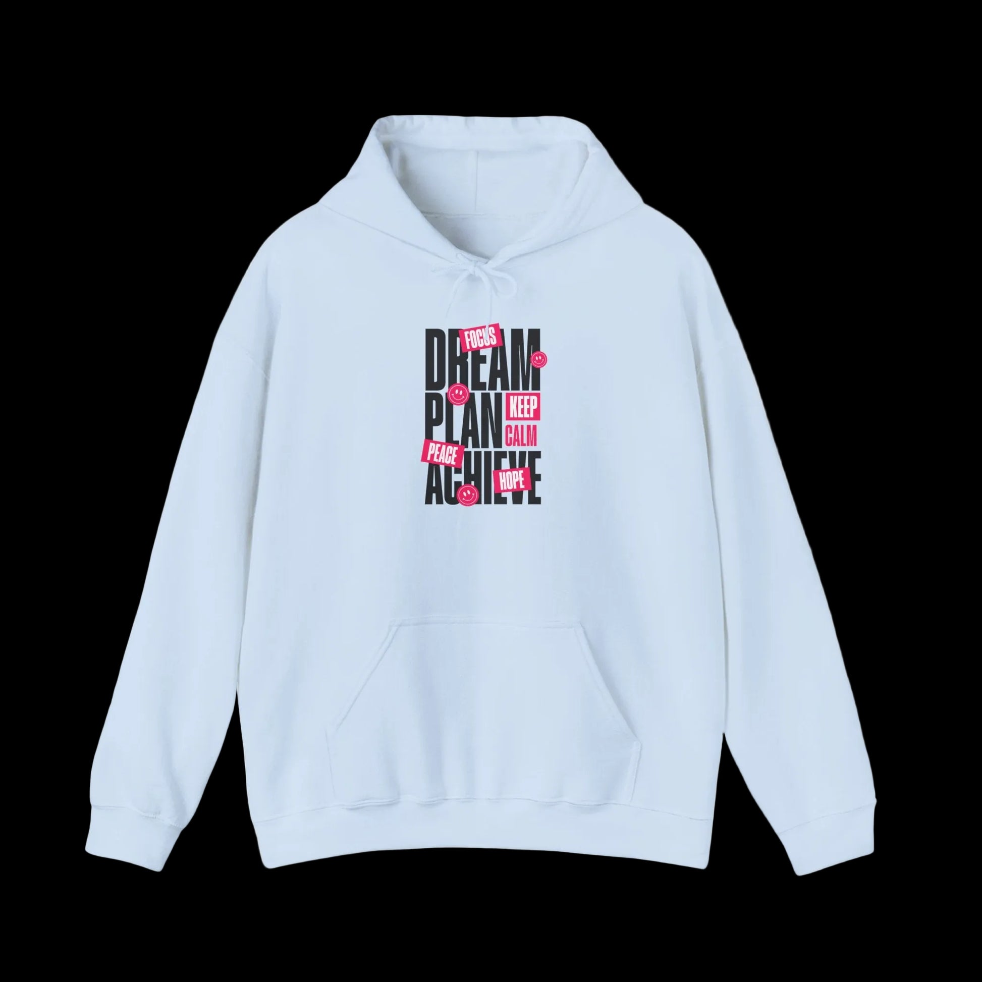 Dream. Plan. Achieve. This hoodie features bold motivational typography with hot pink accent boxes and playful smiley faces - a powerful reminder to focus, keep calm, and stay hopeful.