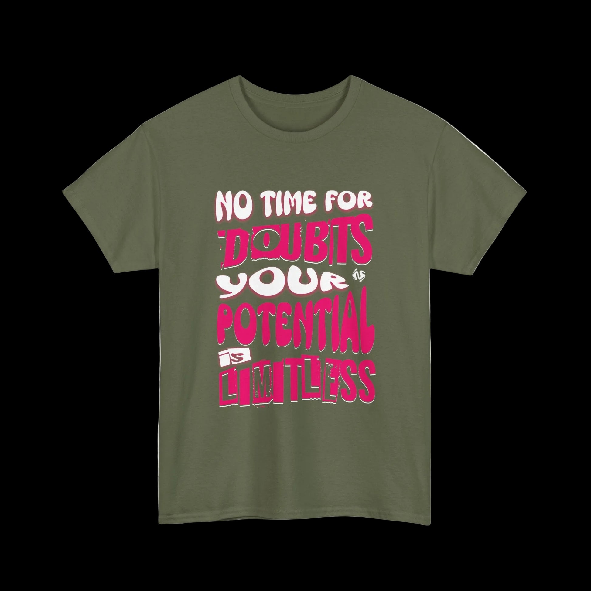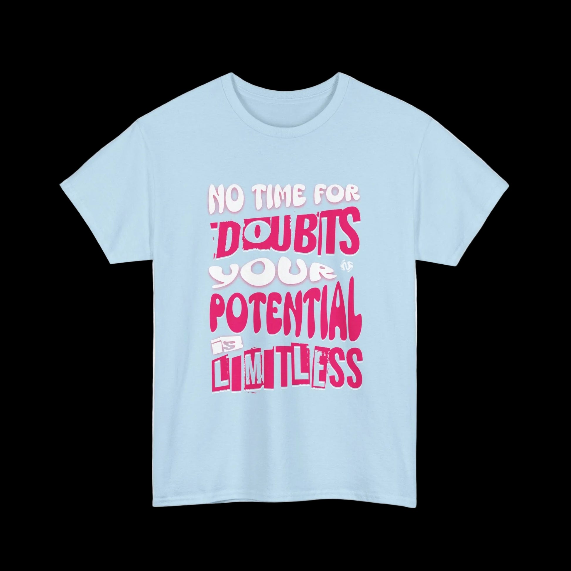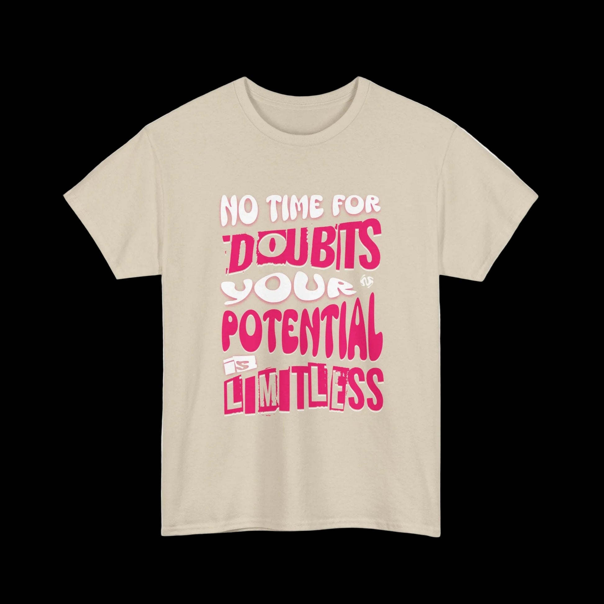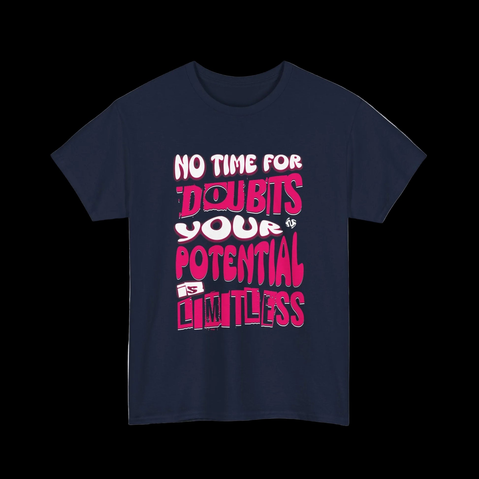 No time for doubts. Your potential is limitless. This t-shirt features bold pink and white typography with a powerful message - stop doubting yourself and embrace your unlimited potential.